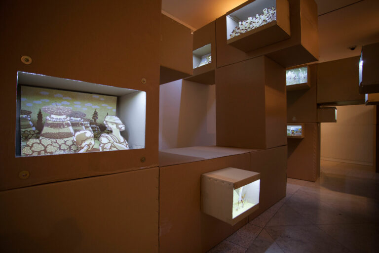 Now these Stories of Today and Tomorrow can be experienced in real-time; Moga Mobo have designed an exhibition based on its internet comics. Dioramic installations bring to life the individual illustrating styles of the 17 artists involved in the project.