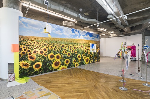 ideas and firm norms likened to maps would not break from her reckless attempts. Hanaco and Mr. Kimchi etc. Playback comes out to the gallery space and appears as being divided and converted into countless Hanacos and tools. ‘Hanaco,’ a faceless body from the video, is realized in various images of the reality from the encounter with ‘Yunyunchoi’ in the gallery space. The objects from the video are laid out under the title of Performance Tool and Media Cache (2017); the existing Hanaco 50 (2015) is amplified into 100 characters each with 100 printed sheets displayed on the wall. They are pointing to one another within a state where it’s possible to access to the scene, like Hanaco from the video, by following the voices echoing in the gallery space. Choi Yun does not stop there but adds several elements in the gallery space. Shoddy objects that never made it to the scenes of Hanaco and Mr. Kimchi etc. Playback such as a Pikachu doll and food models are transformed and arranged here and there as the ‘media cache’ of the show. Around them cache of the cache that is left behind as residue of data despite countless attempts of elimination, like cache files sticks and functions as the insignificant decoration of SS series (2009–2017) that mimics online videos. Likewise, a greeting robot that awakes a vague déjà-vu—hi-bot (2017)—is standing by the entrance to promote the speed of communication. Window Picture Frame (2017) and Sunflower Wallpaper (2017), as images of complete products often used as interior accessories, are attached on the walls. These elements across over the walls as repeatedly attached and detached to one another. And they are linked to the scenes beyond the glass window of the gallery, toward the streets crowded with people wearing modernized hanbok, and another scenes.