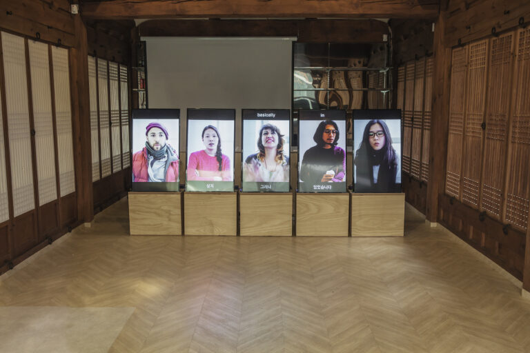 Meanwhile, My Name is Redposes a question on image-making methods for creating horror in today’s society and on stereotypes made by the methodology. To this end, the artist focuses on the images of North Korea consumed in Western society. The work takes an interview form, casting twenty foreigners in Germany. Each member of the cast plays a role who has been in North Korea. They try to fabricate stories with their own imaginary experiences in North Korea within 20 minutes. In the process, their description become a product of mixing their own memories and experiences and the information and images about North Korea fed by media in their society. Paradoxically, this indicates that fictitious images of North Korea are entrenched in their society. Some of the interviews are aired simultaneously or separately from the five channels in the video, which blocks the viewers from tracking each narration. When an interviewee appears on more than two channels at the same time, only some selected words are displayed as subtitles for emphasis, which segmentally represents the opinions of another off-screen speaker, the artist. He takes multiple viewpoints and shifts the speakers to cast a doubt on the principle and external factors of solidifying socially created images.