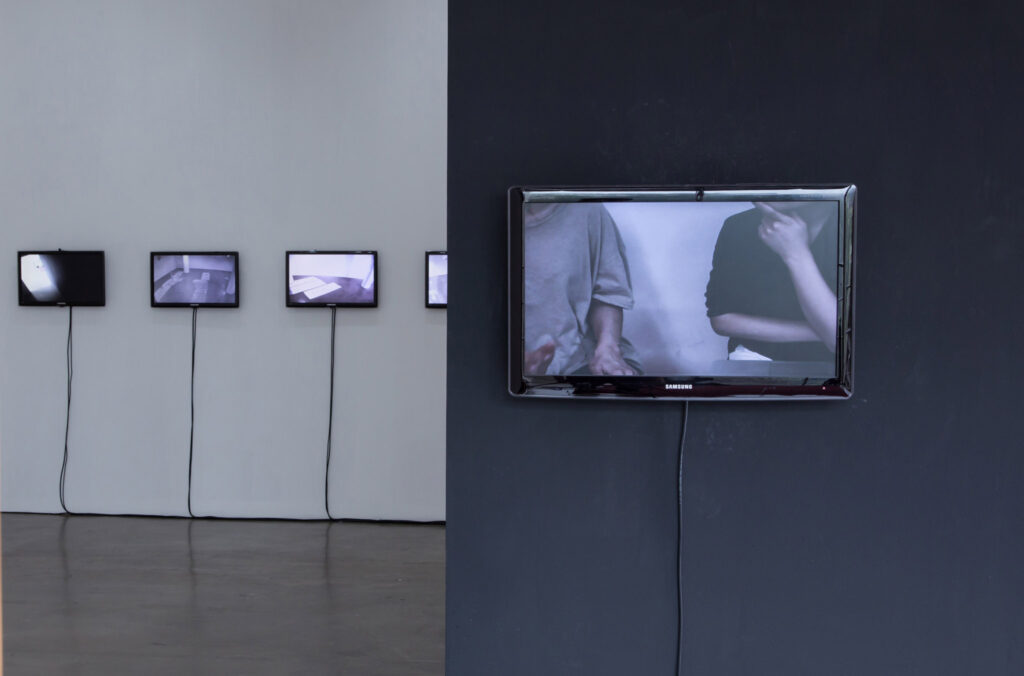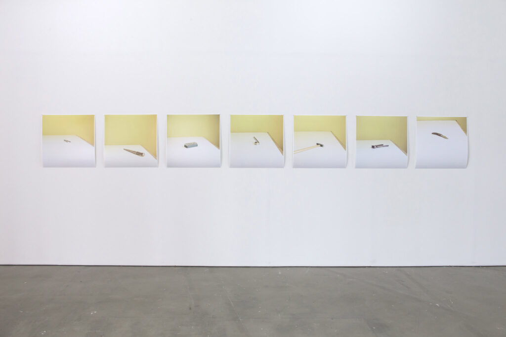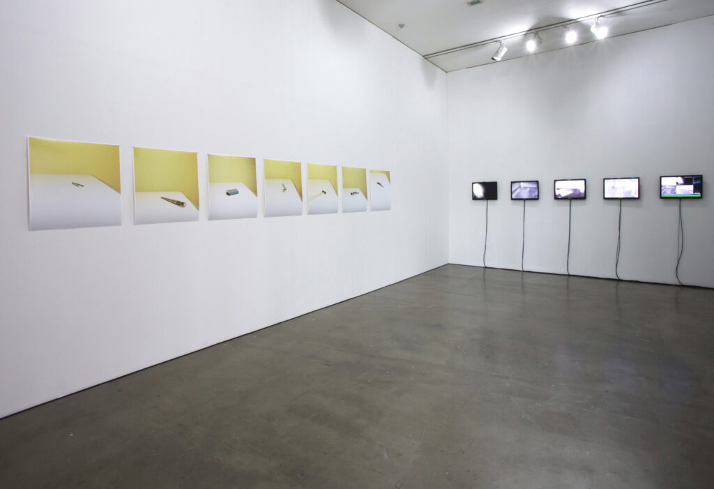 In order to highlight an exhibition as an object, two curators will install CCTV cameras in a separate room for visitors to experience the exteriority of the exhibition space. However, not every screen is running in real time. By mixing real time images with recordings, they question the viewing tradition based on the perception of ‘now and here.’ Next to the screens, Roh Bannwart’s photographs will be exhibited. A series of photography, Things, incontestable and granted, consists of photographs of several tools, independent from interpretative interference, observed in their strangeness and absolute otherness. In the main exhibition space, Roh Bannwart’s interview-based film communicates with the sculpture/object/installation works created by Benoît Maire and Fabien Giraud.