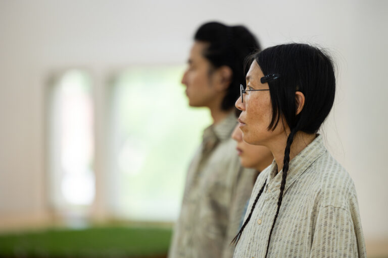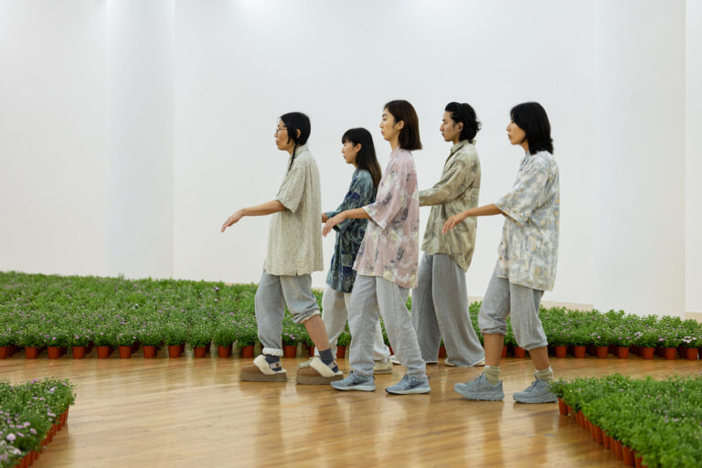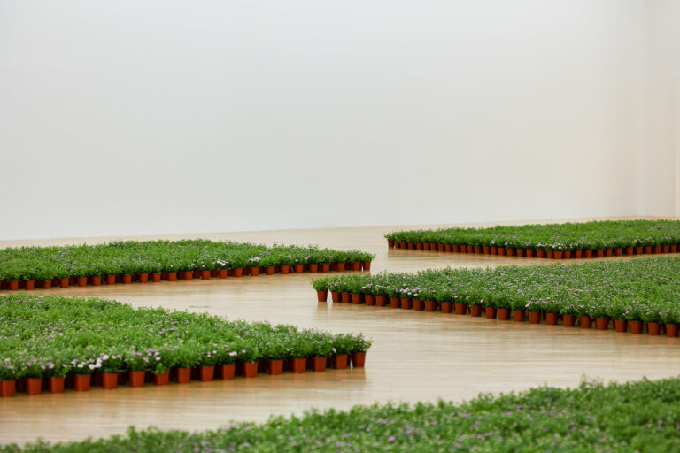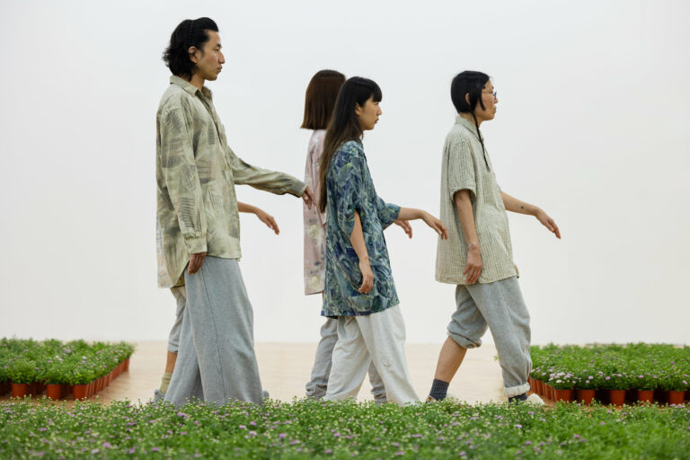 Upon entering Beier’s sprawling sculptural installation Field, visitors are met with 6,000 flowers planted in fake terracotta pots. The repetitive arrangement in meticulous rows with defined pathways gives the sense of wandering into a digital realm of infinite loops and depth. But this isn’t a digital landscape – it is grounded in a tangible reality that echoes the cultivation of fields, each crop a clone of its neighbor, indistinguishable from the next. Kil’s performance Trip takes place every hour. The performers traverse the pathways, carrying out synchronized, choreographed gestures — dragging their feet, marching in unison, pausing abruptly.