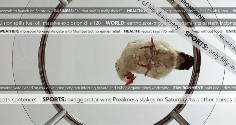 Filmed in New York, Washington, DC, Tahiti, and Tonga, her video Saturday (2017) focuses on the Seventh Day Adventist Church. She was drawn to the Church because its followers observe the Sabbath and conduct baptisms on Saturdays, and because its teachings emphasize the importance of good health and eating habits. For this work, the artist filmed Seventh Day Adventists’ services and recordings of their television prayer program. She combined this footage with scenes of neurological testing, a food commercial, a Botox injection, high-wave surfing, an endoscopy, and political demonstrations. This amalgam of imagery highlights connections between different human strategies to maintain hope in medical, religious and political dimensions.