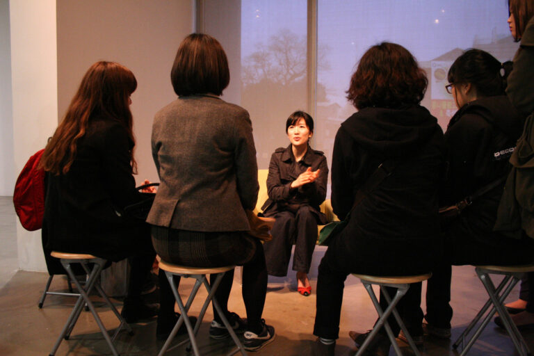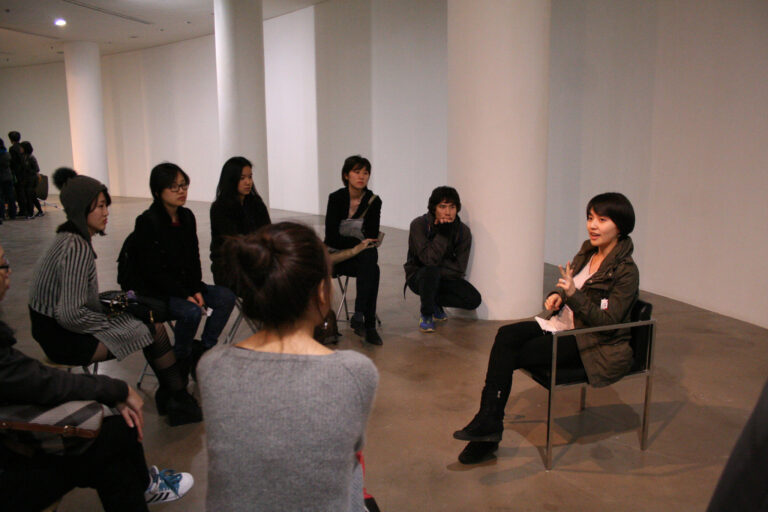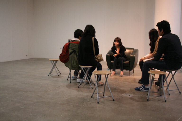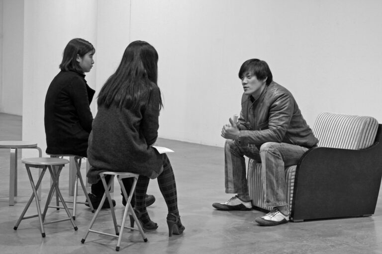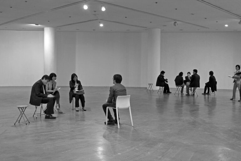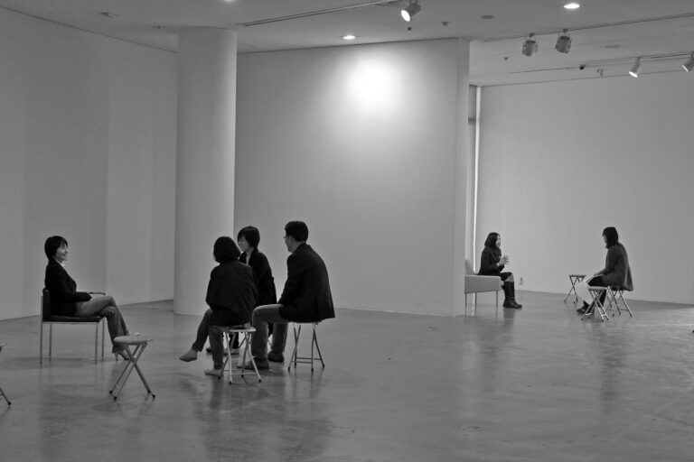 “The performers in this work come to realize that they have to respond to the reactions of the audience, rather than delivering their messages in one direction. This kind of impromptu conversation completely alienates the authentic meaning of the original and generates a new text. Here we cannot see any fixed ending. Rather, we discover a story structure that continues itself. Successive connections between artist-performer-audience, are reproductions of a politics also known as a meeting.” -Gimhongsok