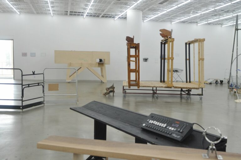 In the exhibition, the objects become like a multitude of small theaters, each filling out the space with its physicality while functioning as a basic component of the theater, and serving as a mechanism for weaving floating images into a certain narrative. These objects move along a trajectory strategically set by the artists while they transport and transform the narratives.