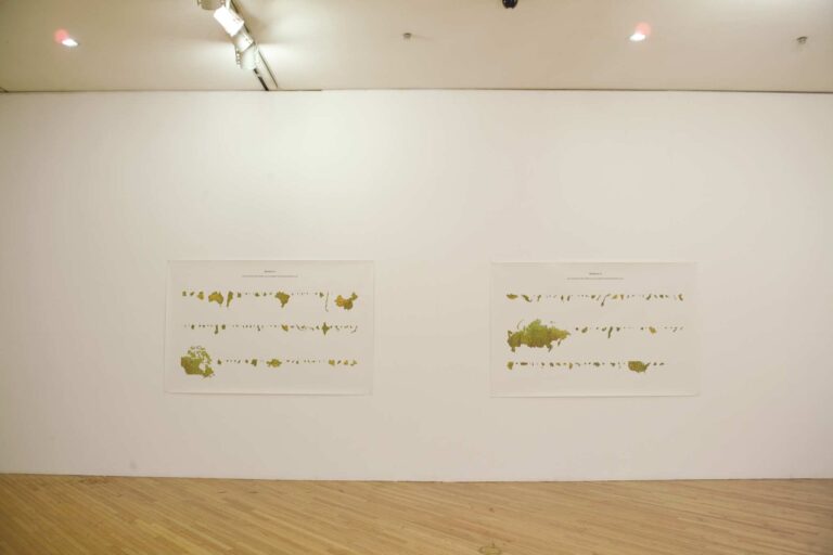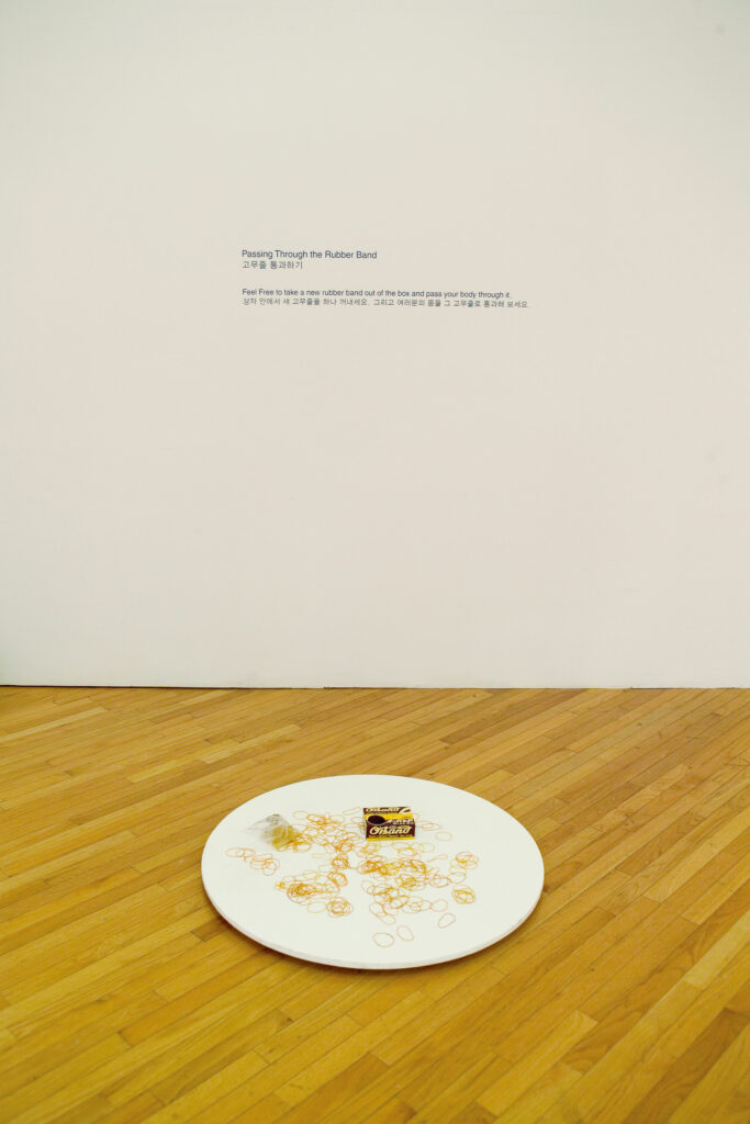 The idea of mixing suggests a totally different perspective by collapsing the old concept of space/time and stretching the scope of imagination. Kirsten Pieroth, who notes the relationship between heterogeneous objects, compares and analyzes the dis/similarities of the objects and highlights the fictionality of conventionalized ideas. Pieroth situates familiar ordinary objects in a strange setting and throws a question on the identity framed by formalistic, cultural, and conventional concern. In her “Weltkarte”(World Map) series, she jumbles the names of all countries on the planet and rearranges them strictly in alphabetical order in her new version of world map. This piece stimulates us to have a new insight on the international relationship by questioning the identity and value embeded in geographical location on the map. Shimabuku’s “Passing Through the Rubber Band” presents a pile of a yellow rubber band with a little note displayed on the side, which invites viewers to try passing themselves through the bands. “You might think it ridiculous at first, but while you are actually struggling to pass through, you will find yourself feeling proud of your challenge and achievement, and sensing the passage of time.” By encouraging us to delve into apparently trivial, meaningless activities, the artist makes us awaken our imagination and realize new possibilities concealed in an invisible space and ephemeral moment.