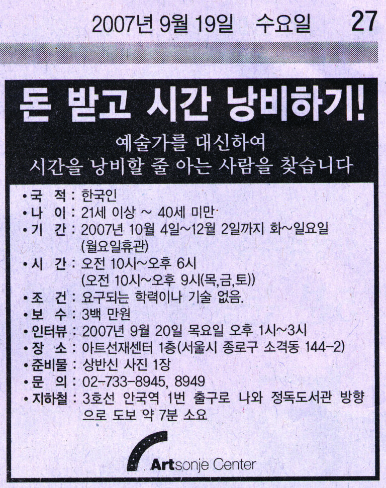 - [Art Sonje Center] Choi Jeong Hwa, Jan Christensen, Liam Gillick, Pierre Huyghe, Lim Tzay-Chuen, Sarah Morris, Antoni Muntadas, Sergio Prego, Tobias Rehreberger, Martha Rosler, Tino Sehgal, Allan Sekula, Bruno Serralongue, Shimabuku, Do Ho Suh, Rirkrit Tiravanija, Xijing Men(Gimhongsok, Tsuyoshi Ozawa, Chen Shaoxiong), Haegue Yang