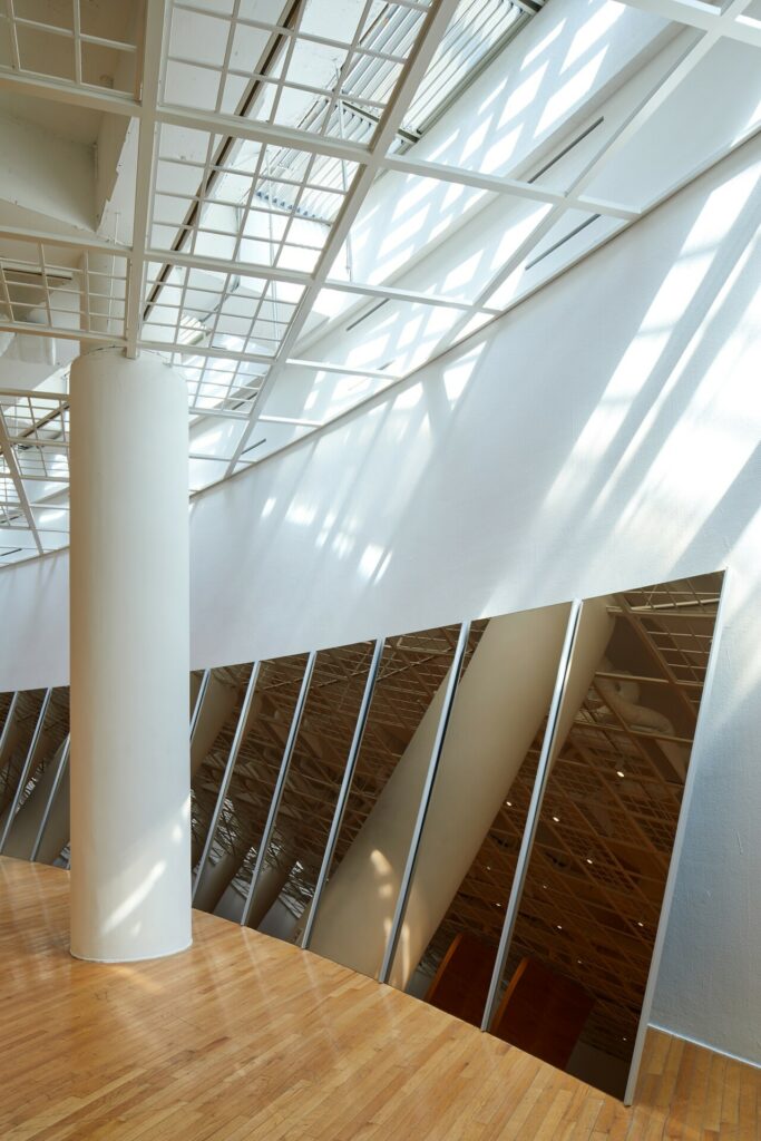 Donghee Kim’s work involves referencing and inventing new uses for the architectural elements of space. For his solo exhibition 3 Volumes (Audio Visual Pavilion, 2017), he created volume by overlaying diagrams for three spaces as a means of shaping space. The latest exhibition utilizes the same methodology: establishing a particular layer in space and then adding volume to it. Volume: Type 1, 2 is installed at the entrance of the second floor gallery and along the curves of the third floor. The second floor uses the landscapes and light that enter through the glass, referencing the composition of a typical lobby. On the third floor, the installation internalizes the gallery’s skylight, where light enters along the building’s curving contours. Both works use windows to bring outer landscapes and light inside, assigns purpose and function to the pieces. Referencing a building interior for the second floor and exterior for the third, the artist forms a relationship of mutual response.