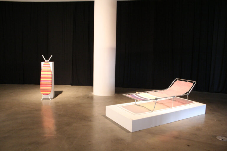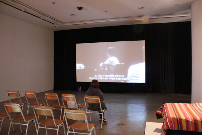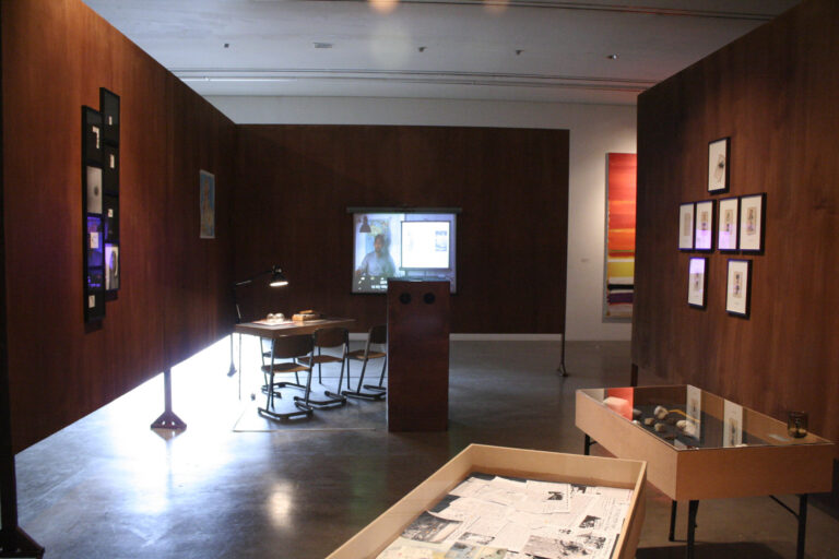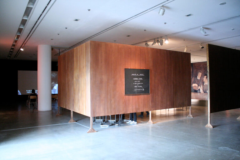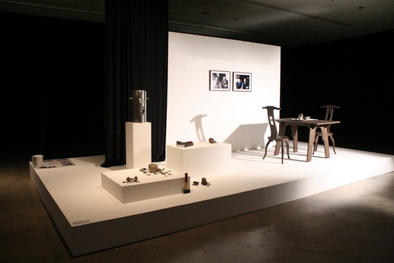 Rehearsal for a Reunion (with the Father of Pottery) (2011-12) represents the reunion between Fujiwara and his distant father through a ceramics workshop. Due to his multicultural background, Fujiwara was able to closely relate to Bernard Leach, the “Father of British Studio Pottery,” who was also raised in Asia. This led the artist to re-enact Leach’s workshop when he reunited with his father in Japan. For Rehearsal for a Reunion, Fujiwara recreates the place of the reunion on a stage installation, onto which a video of the re-enactment of the event is projected.