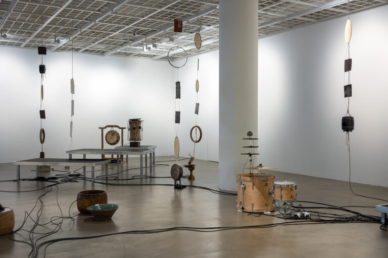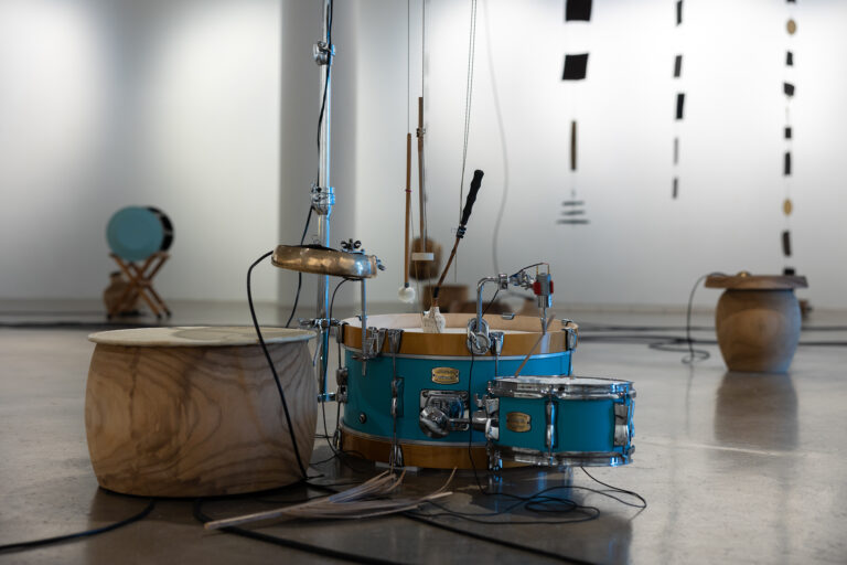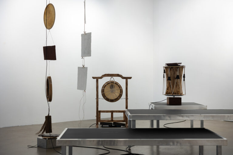 In this exhibition, Atoui’s instruments defy convention. They produce sound through non-traditional means, foregoing the conventional striking method found in traditional percussion instruments such as muk (drum), daebug (large barrel drum), janggu (hourglass-shaped drum), ggwaenggwari (small handheld gong), and jing (gong). Each instrument incorporates embedded speakers, utilizes the vibrations of everyday objects placed on top of drums, and employs mechanical movements to orchestrate an ensemble of unique sounds. Tarek Atoui: The Rain transforms the museum space into a captivating new soundscape, inviting visitors to explore sound through a variety of sensory experiences.