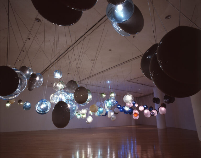 The <7 ends of the world>, which was on view at the Venice Biennale, 2003, creates a spectacle of 222 glass lamps hanging from the entire ceiling of the exhibition hall on 3rd floor. This piece was realized through a collaboration with Murano glass artisans of Venice. The glass lamps are of seven groups of color which denote respectively the seven places of the world, Rehberger himself claimed to pronounce as the best places he wishes to be on the last day of this planet. Observed closely, the lighting of each color group is subtly being controlled by the internet that records and responds to the sunlight of the seven places.