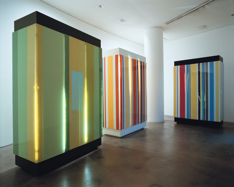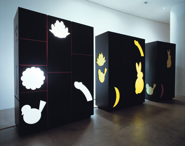 The <Videobibliothek>(Video Libraries), another new production, most recalls the artist’s earlier work in the use of colors and futuristic design which was typical in the 1970s. As the title suggests, the piece takes the forms of a film archive, that is, a collection of film excerpts. The excerpts are diverse in their origin, but bound in the same thematic category of “loss’. Playing on TV monitor concealed inside each cabinet, however, the movies are inaccessible. Audiences are drawn to glimmering light and murmuring sound sneaking out from the edges of the doors, only to find it impossible to signify exact meaning of the information.